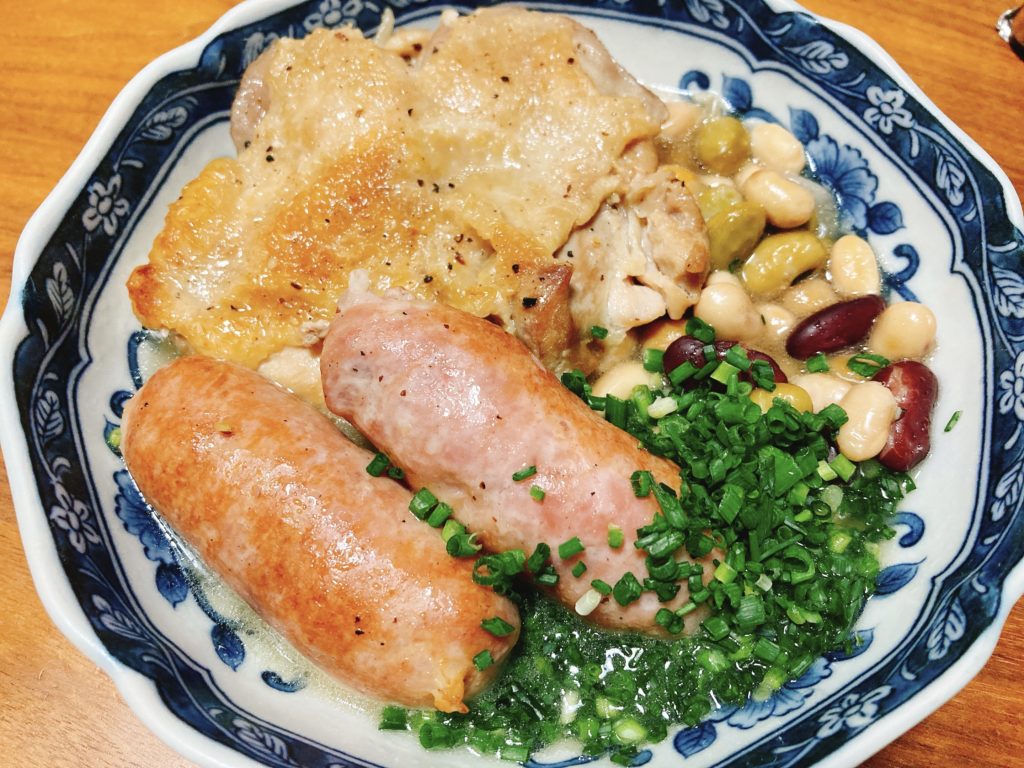 鶏もも肉、豚ソーセージ、白ワイン、ブラックペッパー、コンソメ、ビーンズミックス