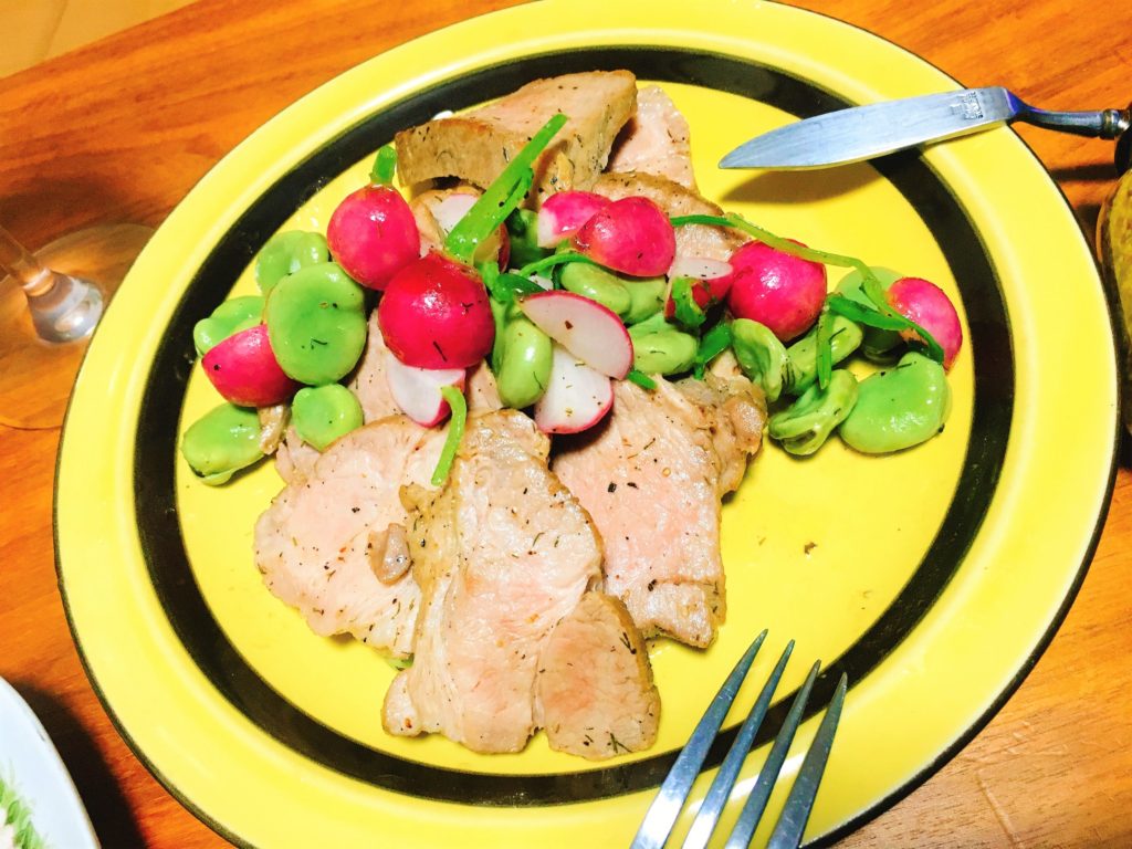 豚もも肉、そら豆、ラディッシュ、粒マスタード、ローズマリー