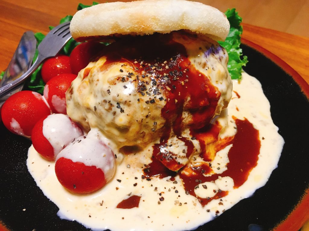 玉ねぎ、豚ひき肉、生クリーム、チェダーチーズ、ミニトマト、デミソース、マフィン
