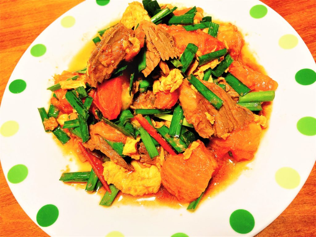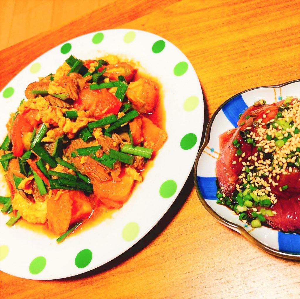 - トマトとにらを加えサッと炒めてボールに出しておく