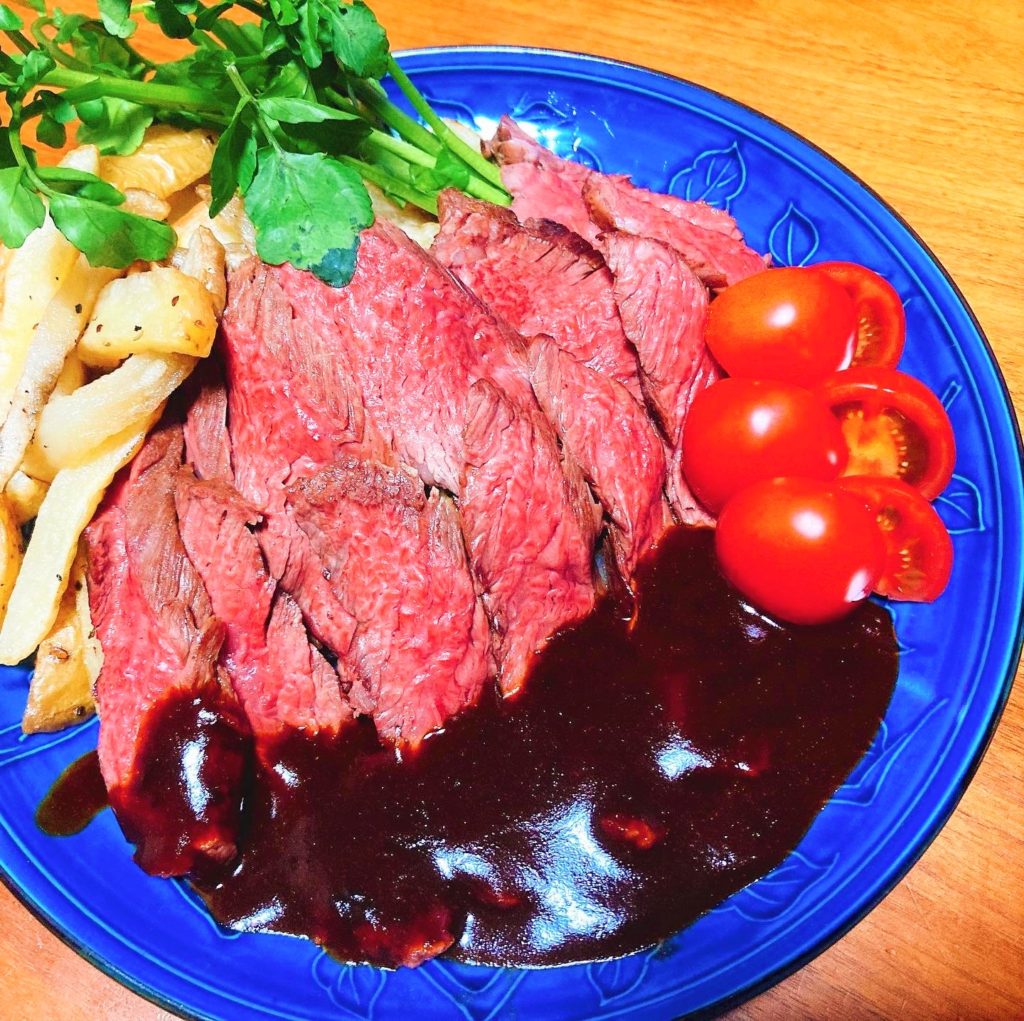 - お皿にフライドポテトをのせハラミをカットし盛り付ける